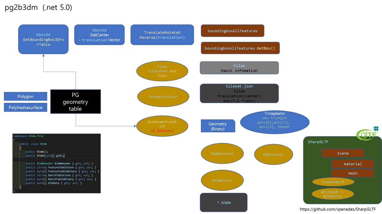 pg2b3dm은 .Net 5.0을 사용합니다. Docker 이미지가 존재하여 별다른 환경 셋팅 없이 사용할 수 있습니다. 하지만 데이터 구조가 정해져 있어 활용하기에 다소 까다로운 부분이 있어서 사용하고 있는 gepmetry colume이 Polygon이여서 해당하는 부분만 수정하여 진해해 보았습니다. 데이터 로드하는 부분과 Styling하는 부분을 좀 수정하였습니다.